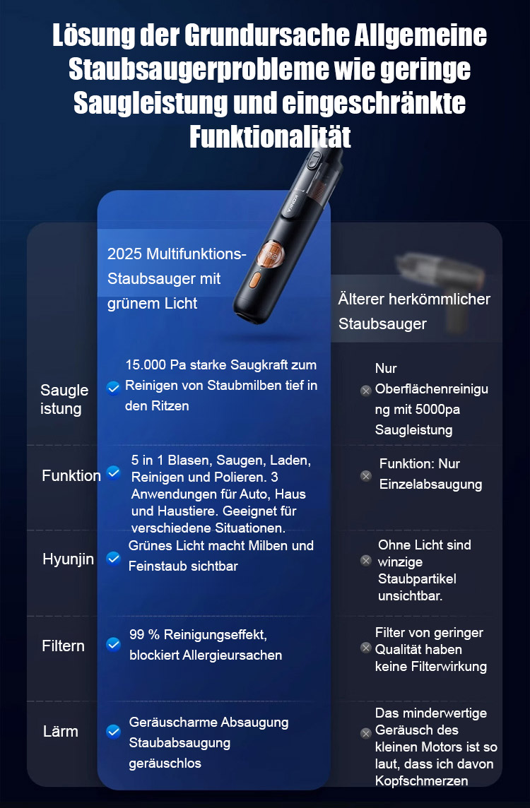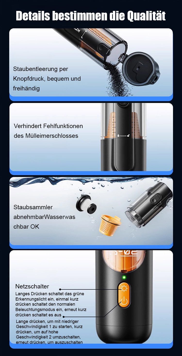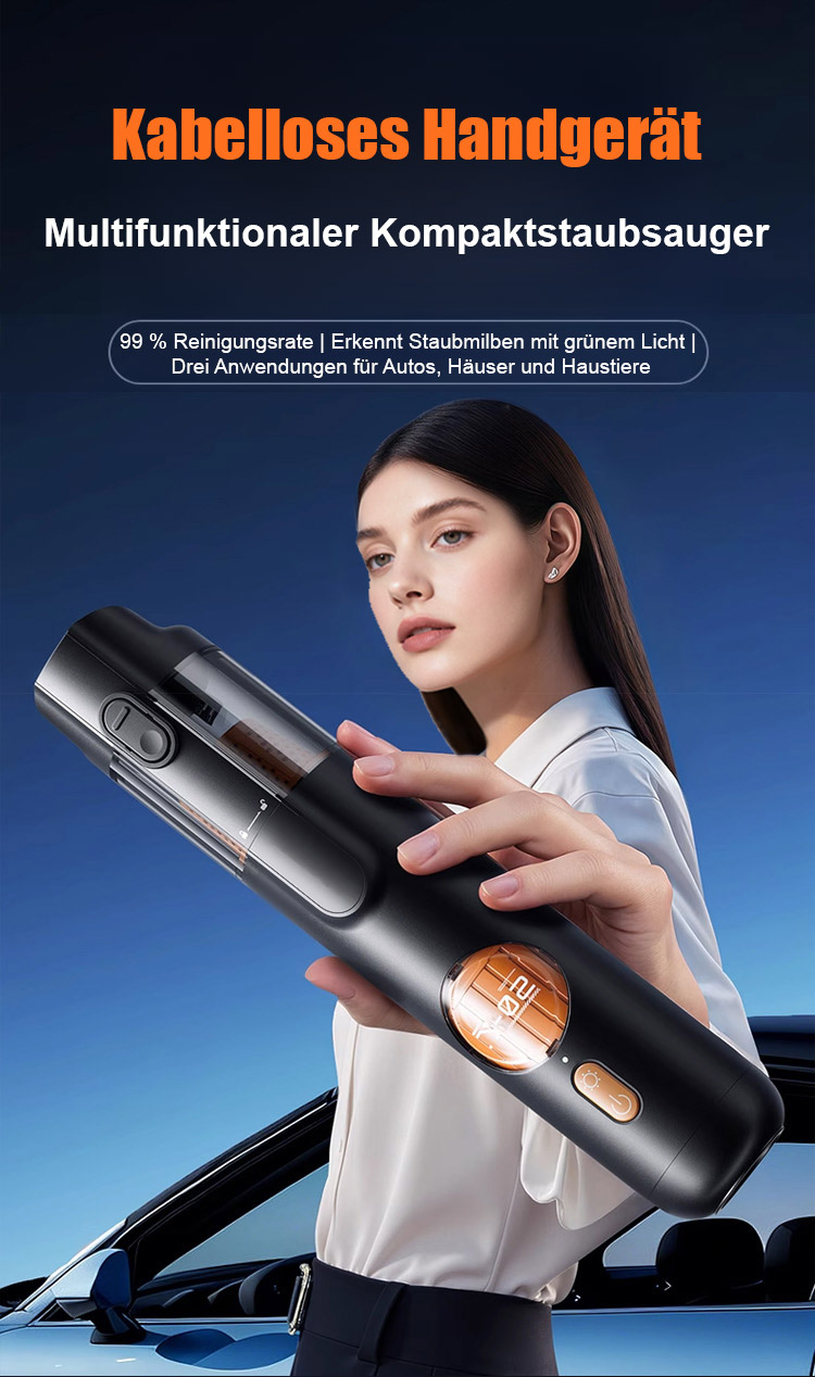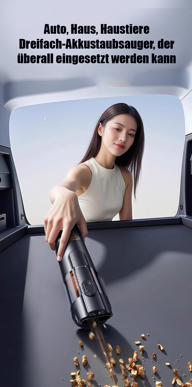 ⏰Ausgestattet mit einem bürstenlosen Motor aus Europa liefert er eine starke Saugkraft von 15.000 Pa und entfernt mühelos sichtbaren Staub sowie selbst Haare und Feinstaub aus den tiefsten Sitzspalten.